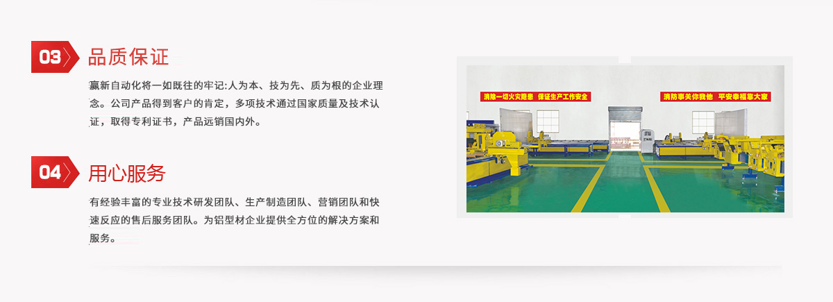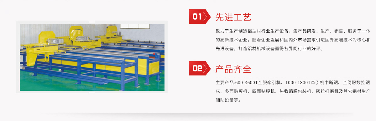 公司始终秉承:科技创新、节能环保的理念。成功开发并投产的主要产品:600-3600T全服牵引机、1000-1800T牵引机中断锯、全伺服数控锯床、多面贴膜机、四面贴膜机、热收缩膜包装机、颗粒打磨机及其它铝材生产辅助设备等。公司产品得到客户的肯定,多项技术通过国家质量及技术认证,取得专利证书,产品远销国内外。